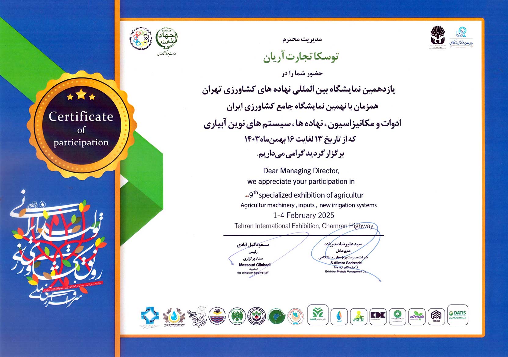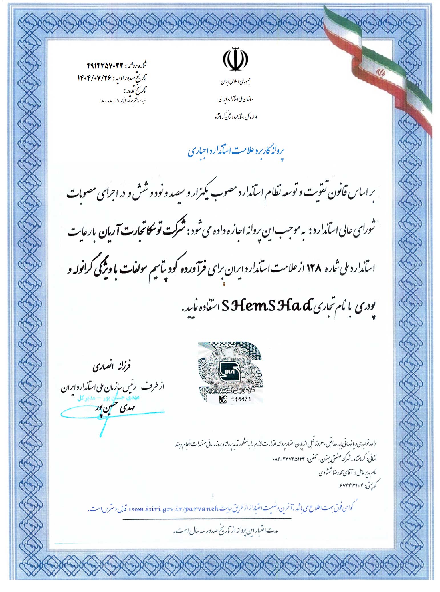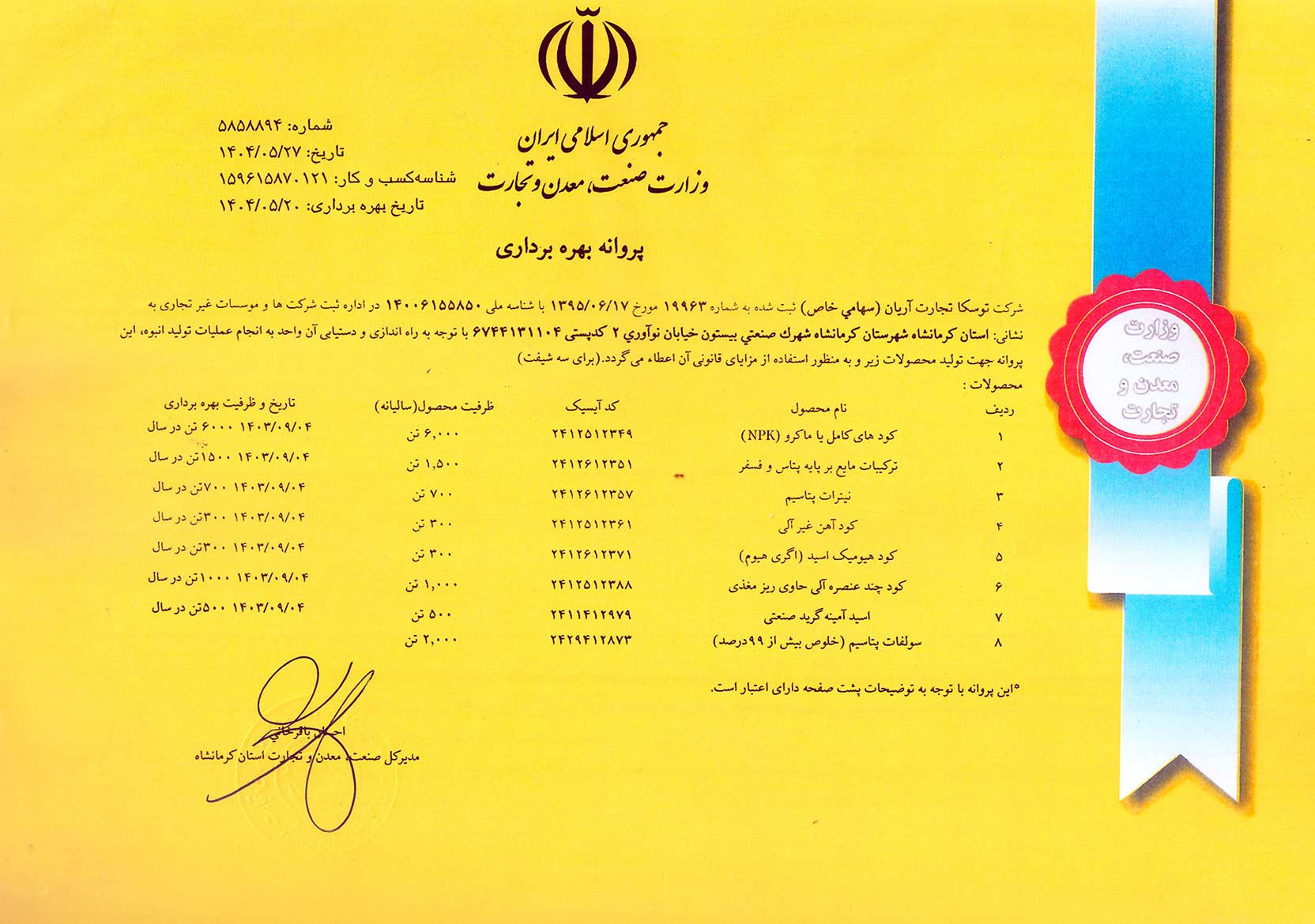 ∇ کرمانشاه ، شهرک صنعتی بیستون ، خیابان نوآوری 2 ، شرکت توسکا تجارت آریان 7-34735144-083 / 09198070347